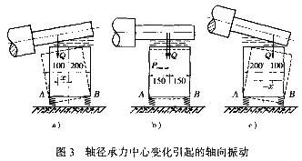 所謂軸承扭振是軸在旋轉(zhuǎn)狀態(tài)下,軸承對軸的承力中心點(diǎn)將隨轉(zhuǎn)速周期性地沿軸向變化。圖3a表示轉(zhuǎn)子在某一位置時,軸承承力中心點(diǎn)偏于A側(cè);圖3c表示轉(zhuǎn)子轉(zhuǎn)過180°后,軸承承力中心點(diǎn)偏于B側(cè)。若軸承座和基礎(chǔ)沒有彈性,則軸承承力中心點(diǎn)的變化始終在軸承座底邊AB范圍內(nèi),它不會引起軸承座的軸向振動。實(shí)際上,軸承座和基礎(chǔ)組成的支承系統(tǒng)具有一定的彈性,在軸承承力中心點(diǎn)周期性變化的作用下,軸承座將沿某一底邊發(fā)生周期性的軸向振動,且振值忽大忽小,極不穩(wěn)定。即使軸承座固定螺栓很緊,這種現(xiàn)象也難以避免。